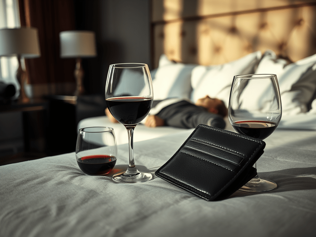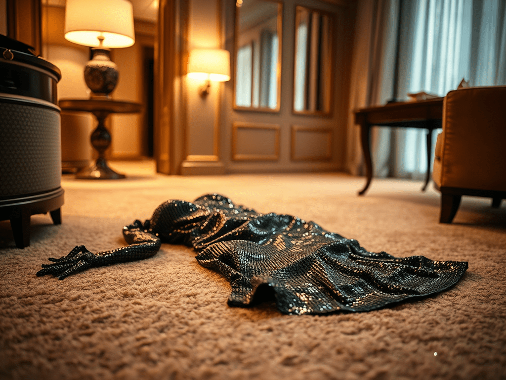“Tomorrow,” she says, “but not until afternoon. He requested a late check-out. We will be gone by then.” It isn’t guilt in her voice. It’s logistics, always the next move three steps ahead in her mind. The faucet drips in the bathroom. The laugh track on the TV spikes, some canned joy over a dead man. My stomach twists. She lights another cigarette.